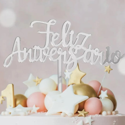 Topper Acrílico Prateado Feliz Aniversário 14cm