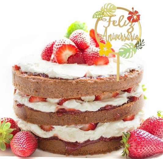 Topper Acrílico Dourado Feliz Aniversário Tropical 18cm