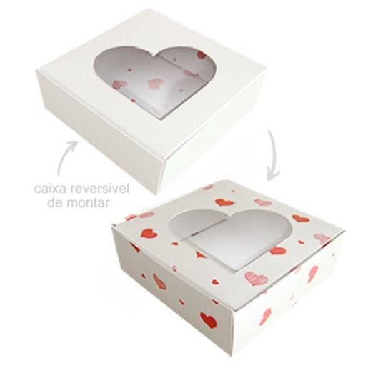 Caixa papel reversível branca e corações c/ janela p/ 5 bombons/brigadeiros
